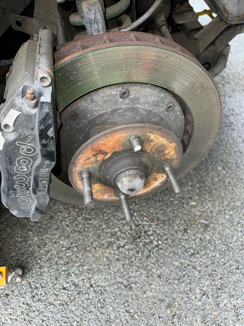 We have a lunch break and all eyes are on the skies as we have had dry runs so far but the black clouds are ominous and our race numbers are in the last batch so we, the Ferraris, Morgans and the bikes are the last to run. The heaven open- in a biblical manner and Len is quick to change from his slick tyres to a road going treaded version. Different wheels and different wheel nuts and spacers. Len is fitting his last wheel, and the last stud, when tightening with a torque wrench a long stud breaks on the osf. Now the bad luck is with him! He searches in his van and discovers he has spare wheel studs – and on the his TR4 they are the splined pull in type. On closer inspection its apparent that it’s the only stud that has been welded in !!! typical.