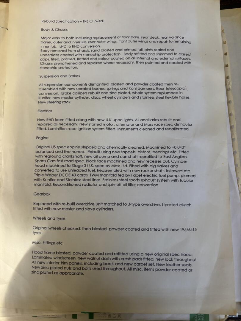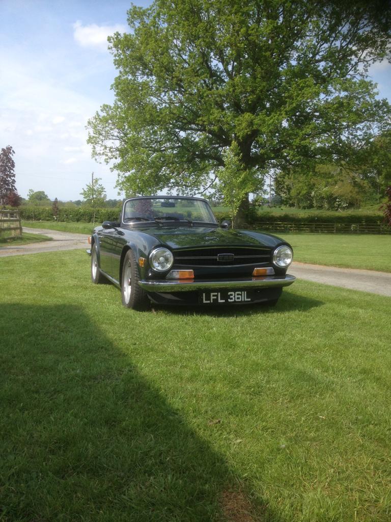 TR6 for sale - British racing green (but in certain light looks black green). Too much detail to put in writing, please give me a call if interested. Location - Welshpool west of Birmingham. This car is definitely worth viewing. White hardtop in good condition and most of the fittings which will be included in the sale. Underside wipes clean to reveal powder coating as it wasn't undersealed after complete rebuild. Nothing hidden. £16K