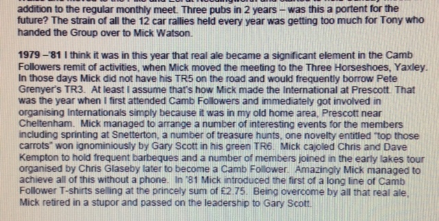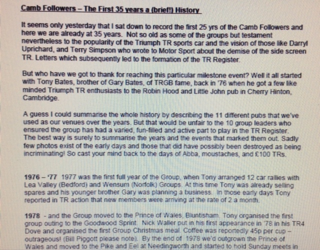 As it is the Club’s 50th Anniversary in 2020, and hence some looking back in time, reproduced below in rather poor quality is a copy of the History of Camb Followers 1976-2011, issued for their 35th Anniversary. The original pdf is held on disc by the TR Register office archive at Didcot, and is hence currently not available to view on line. It was only issued to members at the time so newer members to the group will not have seen it.