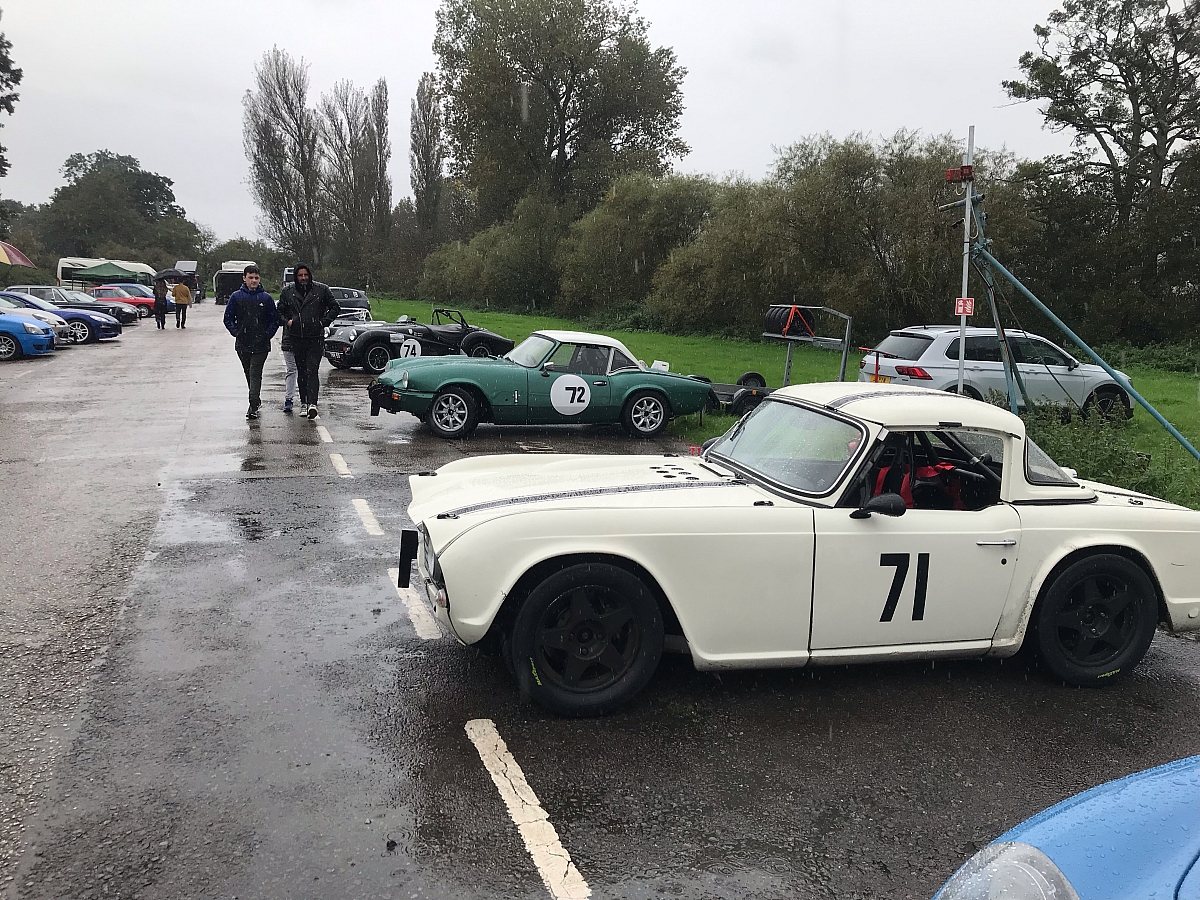 The organisers managed to squeeze in the first timed run (the ones that count in the championship scoring) before lunch as the skies were darkening and looking ominous. However, as the Triumph class was last on the running sheet the heavens opened in a biblical manner as we sat waiting out turn. The wet took its toll on the track turning it into a skid pan after all the dry runs rubbering in the track and especially the start area which naturally affected all our times, Hamish with some judicious positioning on the start line to try and avoid the well used slippery area managed a 80.54sec, Shaun 84.16sec, Matt 89.44sec, Derek 89.60sec. The second timed run was to be the final run of the day saving the poor marshals from further torment of the heavy rain and the resultant offs by other competitors. Shaun took the opportunity to change his wheels for his preferred wet set of road legal tyres in the hope of having the edge. Hamish having driven to the venue was stuck with his dry bias tyres. So it was all or nothing for the wet final run of the day and Hamish’s final run of the season to decide the class standing for the event. With skilful driving by all in the Triumph class, most improved their wet times and more importantly everyone finished in on piece. 1st Hamish 79.40sec, 2nd Shaun 80.68sec, 3rd Matt 85.38sec and 4th