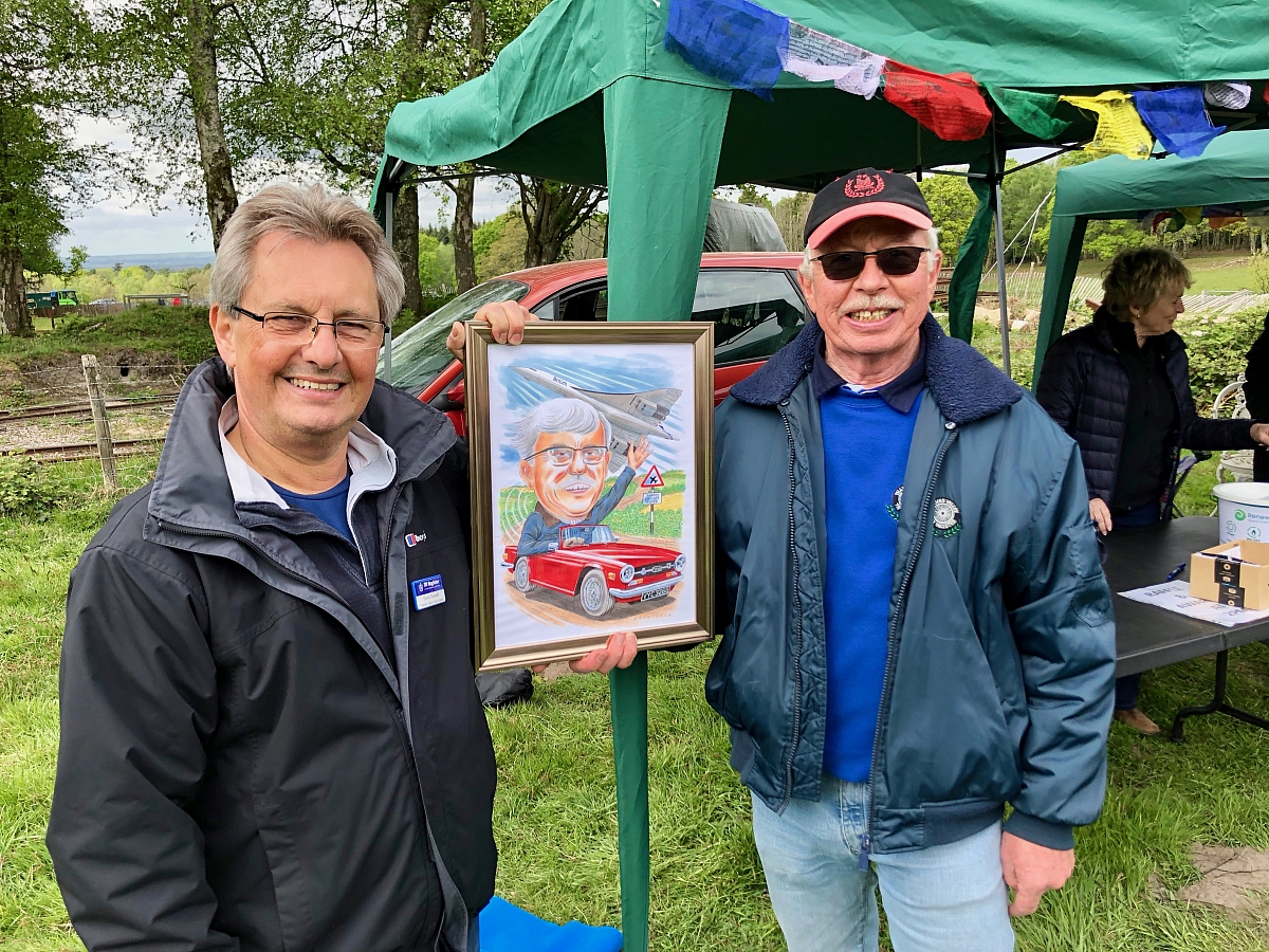 The picture shown was presented to Mervyn as part of the closing ceremony of the 2019 South East Drive It Day, organised by Thames Valley at Hollycombe Steam in the Country in recognition of his services to the Group. It was drawn by TR Action's very own Peter Entwhistle and features Mervyn driving his TR6 with a Concorde flying overhead.