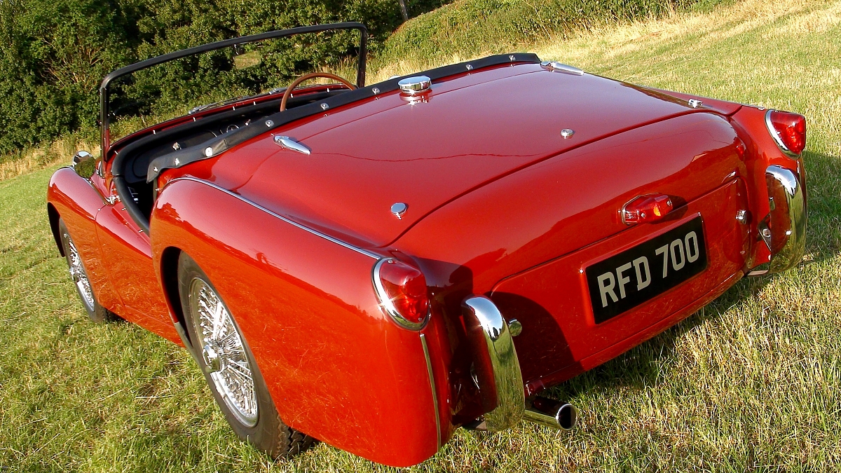 The result of a complete redesign of the 20TS prototype in 1952/1953, this car had a new chassis frame, more powerful engine and lengthened tail style. Engineering and redesign was by Harry Webster (chief chassis engineer), John Turnbull (chassis), David Eley (engine), George Jones (transmission), and Walter Belgrove (body): testing was by Ken Richardson. The first hand assembled production cars (TS1 & TS2) were completed at Banner Lane in July 1953. Every other car (with 90bhp/1991cc) was assembled in the old assembly halls at Canley. Only 248 cars were delivered before the end of 1953. Until October 1954, the first 4,000 cars were produced with 'long door' body shells. Thereafter the TR2 changed to 'short doors' with body sills under them. Production carried on until October 1955, when the TR3 took over. 8,628 cars built from 1953 to 1955.