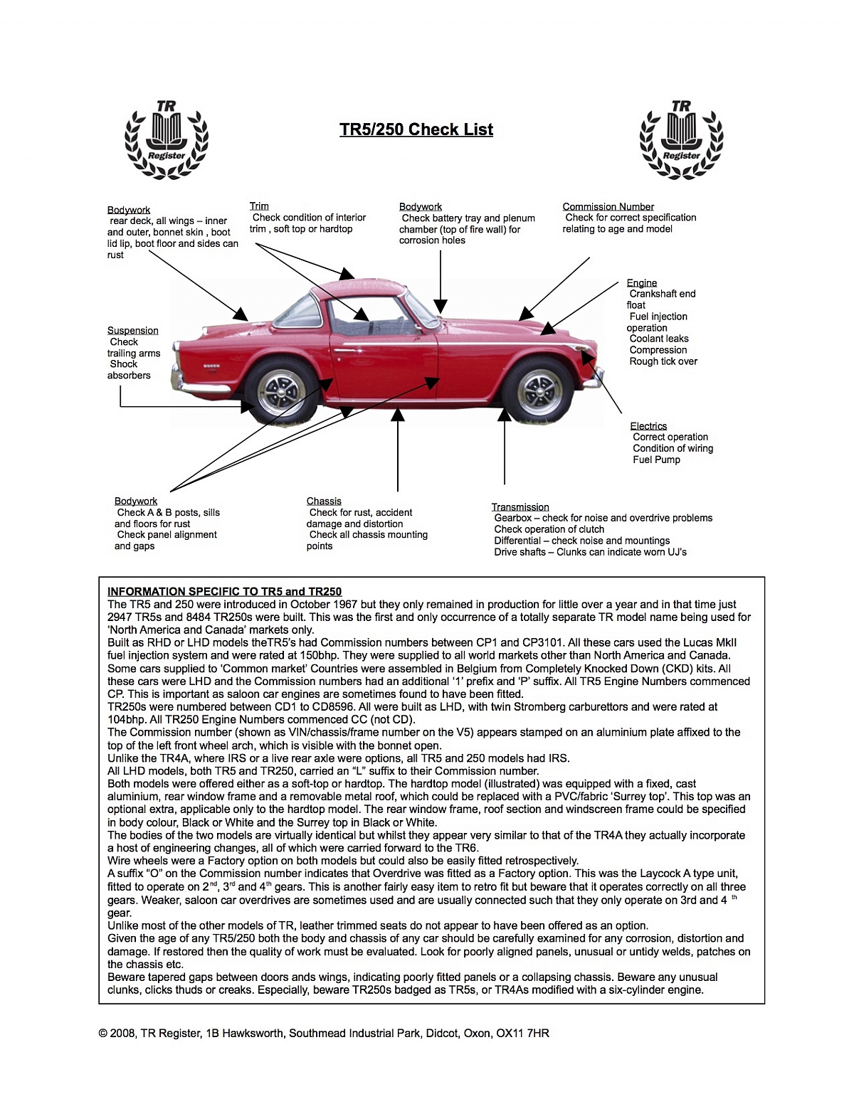 After the body change (1961) and the chassis change (1965) came the engine change of 1967. Except in detail, TR5s looked like TR4As, but there was a fuel injected 150bhp/2498cc six cylinder engine up front. Much more performance than any previous TR (120mph, flat out). None of these cars went to North America when new. Strictly a one season wonder as the re-styled TR6 took over before the end of 1968. 2947 cars built between 1967 and 1968.